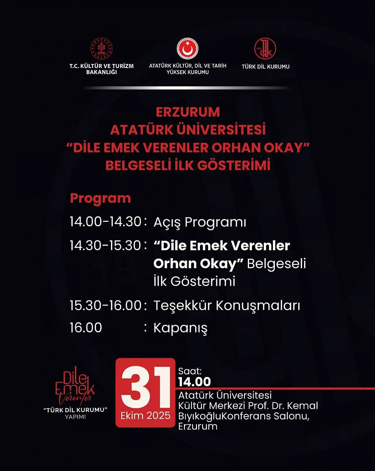 - Prof. Dr. Orhan Okay için Dile Emek Verenler belgeseli, Atatürk Üniversitesi'nde gösterilecek