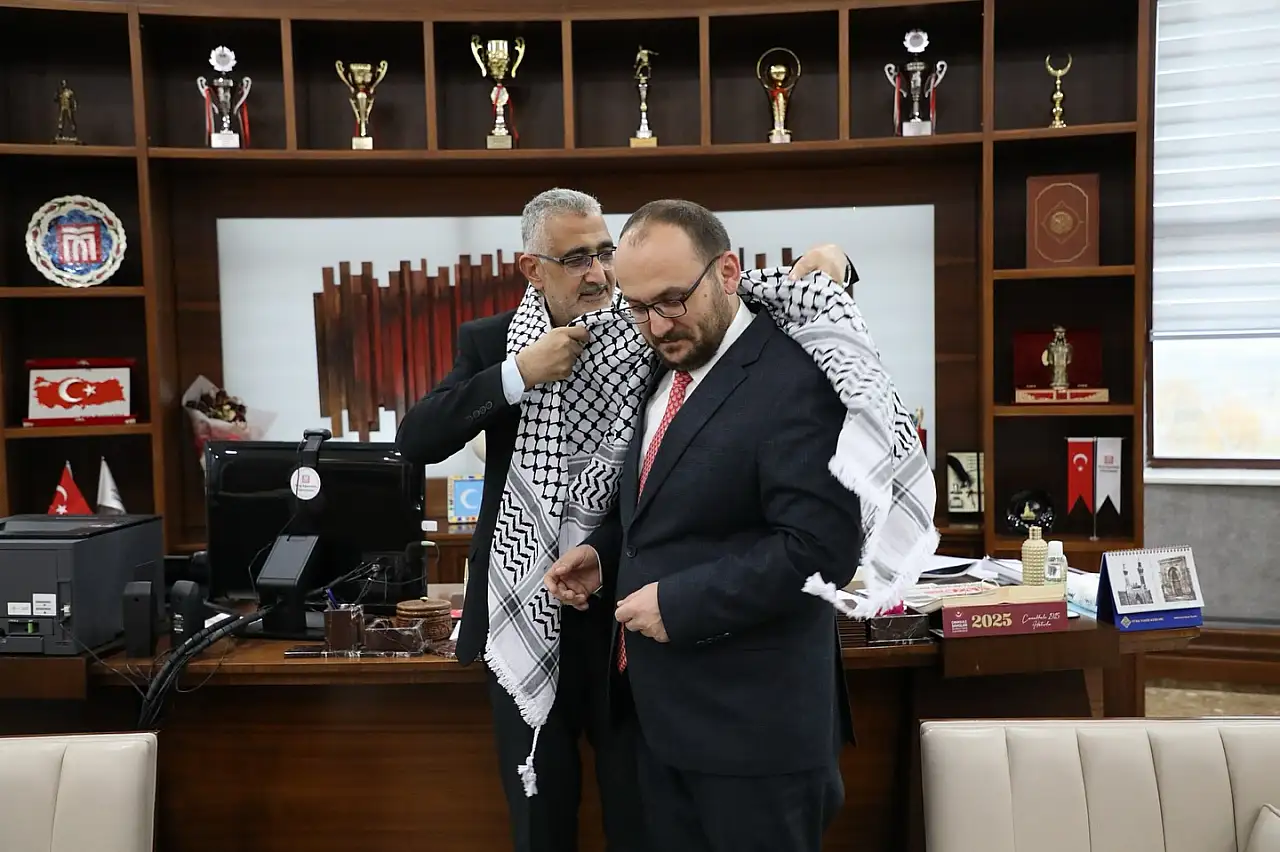 Muş Alparslan Üniversitesi Rektörü Prof. Dr. Mustafa Alican, üniversitede konferans vermek üzere bulunan Gazze Sağlık Bakanlığı yetkilisi Anwar Attaallah'ı makamında kabul etti.