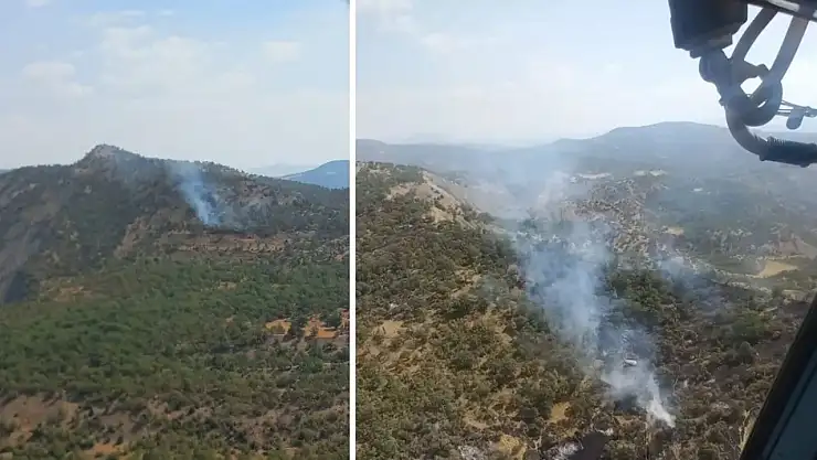 Rüzgarın etkisiyle geniş bir alana yayılan yangının söndürülmesi için yürütülen çalışmalara, jandarmaya ait helikopter de havadan destek veriyor.