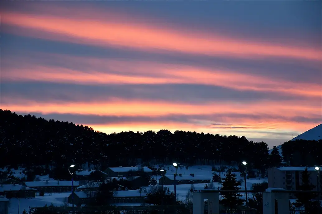 Kars'ın Sarıkamış ilçesinde karla kaplı doğa, gün batımında kızıl ve turuncu tonlara bürünen bulutlarla kartpostallık manzaraya sahne oldu.
