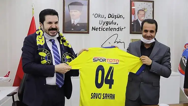 Ağrı 1970 Spor Kulübü Başkanı Mehmet Yıldırım ve kulüp yöneticileri, Belediye Başkanı Savcı Sayan’ı makamında ziyaret ederek kendisine isminin yazılı olduğu Ağrı Spor formasının yanı sıra Ağrı 1970 Spor Kulübü Onursal Başkanlık Belgesini takdim ederek bugüne kadar yaptığı hizmetlerden dolayı teşekkür etti.