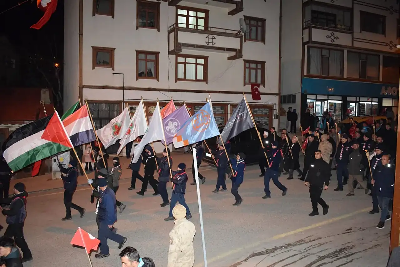 Meşaleler eşliğinde gerçekleştirilen yürüyüşte, vatan uğruna canlarını feda eden aziz şehitler rahmet ve minnetle yâd edildi. Yürüyüşün ardından düzenlenen dua programında, Allahu Ekber Dağları’nda şehadete yürüyen kahraman ecdat için dualar edildi.