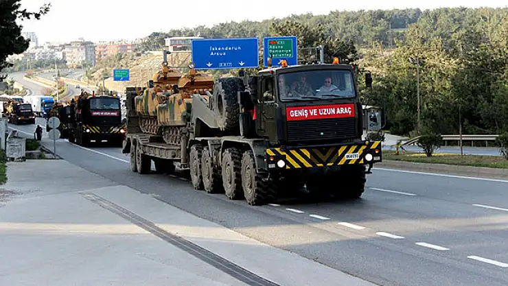 TSK’nın çeşitli birliklerinden karayolu ile Hatay’a gelen aralarında tank ve ZPT’lerin bulunduğu askeri araçlar, geniş güvenlik önlemleri altında konvoy halinde Suriye sınırına doğru yola çıktı.