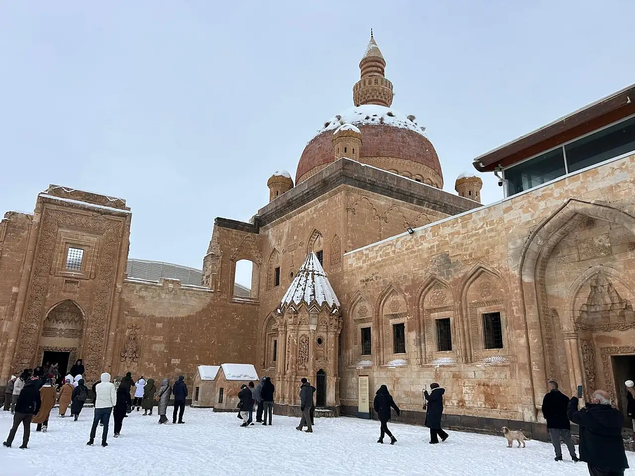 Ağrı'da etkisini sürdüren yoğun kar yağışına rağmen yılbaşı tatilini fırsat bilen çok sayıda vatandaş, karlı yolları aşarak İshak Paşa Sarayı'nı ziyaret etti.
