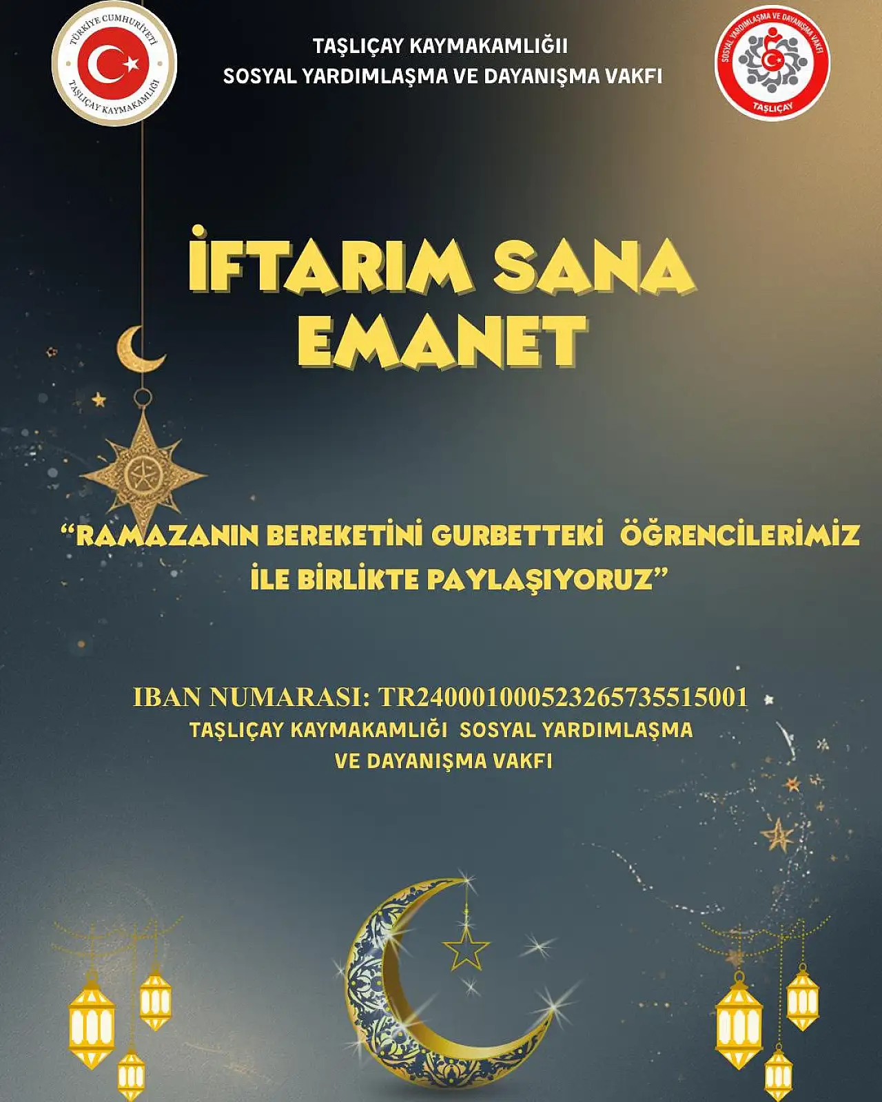 Yapılan çağrıda, ilçe esnafının ve hayırseverlerin sağlayacağı her türlü desteğin öğrenciler için büyük önem taşıdığına dikkat çekildi. Desteklerin yalnızca maddi katkı değil, aynı zamanda öğrencilerin moral ve motivasyonuna da katkı sağlayacağı vurgulandı. Toplanacak yardımların, Taşlıçay Kaymakamlığı Sosyal Yardımlaşma ve Dayanışma Vakfı aracılığıyla değerlendirileceği ve Ramazan ayı boyunca öğrencilerin iftar ihtiyaçlarının karşılanmasında kullanılacağı bildirildi. Destek vermek isteyen hayırseverlerin aşağıda yer alan IBAN numarası üzerinden bağış yapabileceği belirtildi: