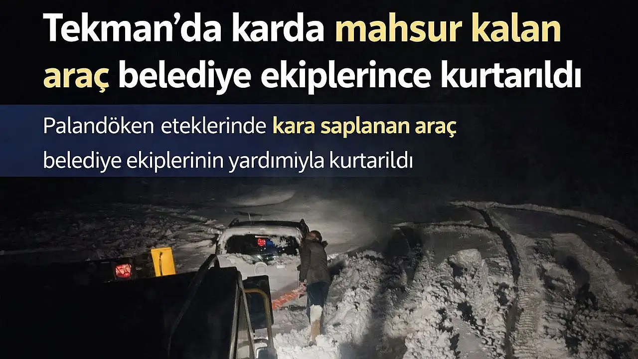 Erzurum'un Tekman ilçesinde yoğun kar yağışı nedeniyle şarampole düşen bir otomobil, belediye ekipleri tarafından kurtarıldı. Mahsur kalan araç ve vatandaşlar, ilçe merkezine güvenli bir şekilde iletildi.