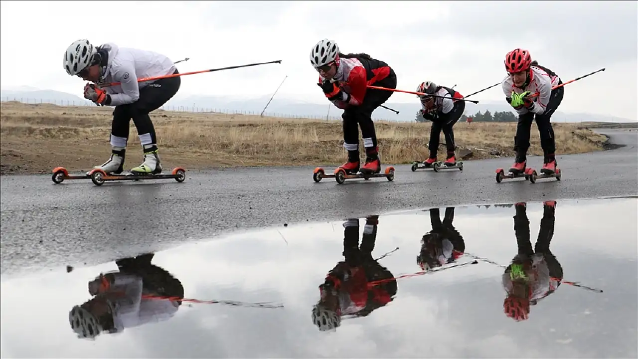 Kış aylarında kullandıkları kayakların yerine tekerlekli kayak kullanan sporcular, bu sayede yıl boyu antrenman yapma imkanı buluyor.