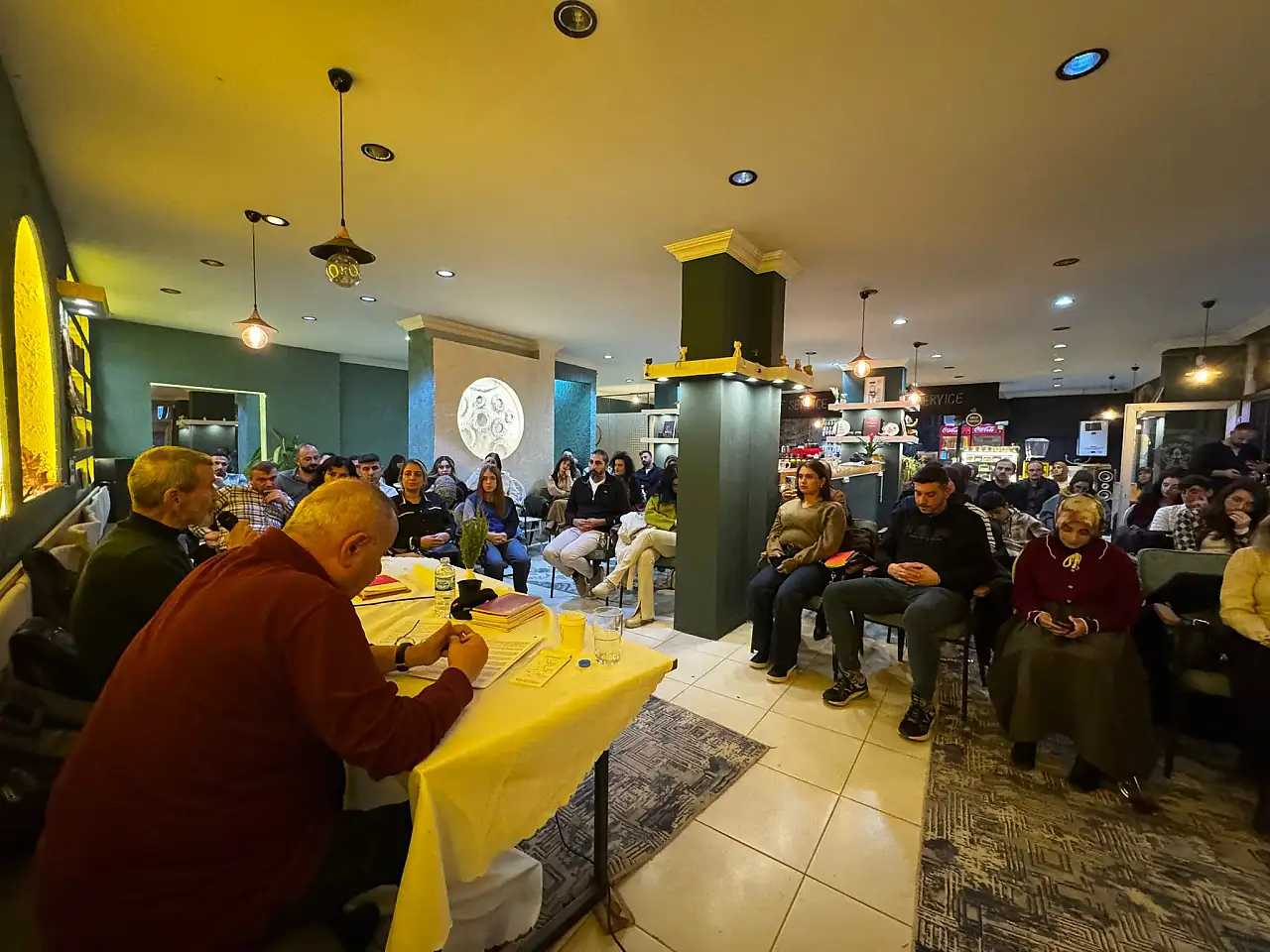 “Geçen hafta Ru Sahaf Kafe’de kitap yorumlama etkinliğimiz olmuştu, bu akşam da aynı mekânda değerli yazarlarımız Ahmet Telli ve Şükrü Erbaş’ı konuk ettik. Böylesine kıymetli isimlerle edebiyatseverleri bir araya getirmek bizim için gurur verici. Amacımız, Doğubayazıt’ta kültürel ve entelektüel buluşmaları sürdürülebilir hale getirmek.”