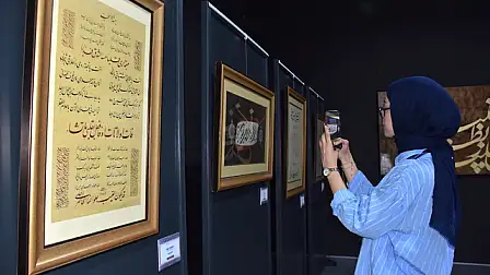 Sanatçıların, İslam sanatını çağdaş tekniklerle birleştirerek yaptıkları eserleri inceleyen ziyaretçilere, çalışmalar hakkında görevlilerce bilgi veriliyor.
