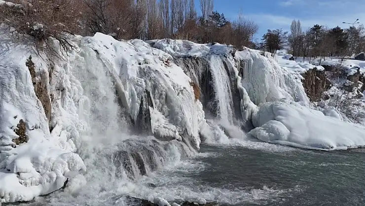 Van'ın simge doğal alanlarından Muradiye Şelalesi, dondurucu soğukların etkisiyle büyük ölçüde buz tuttu.