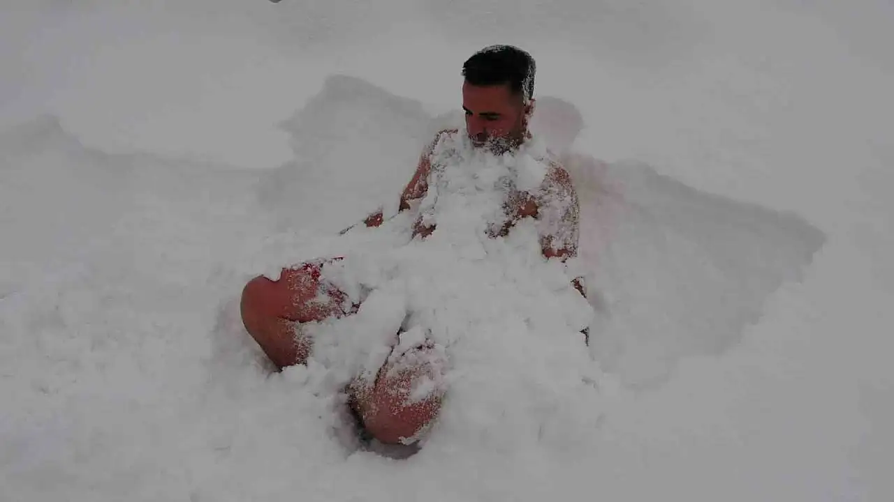 Termometrelerin eksi 8 dereceyi gösterdiği kentte, özel eğitim öğretmeni Muhammed Turken, soğuğa aldırış etmeden karla dolu bir havuza girerek kulaç attı ve kar banyosu yaptı. Dondurucu havaya rağmen dakikalarca karın içinde kalan Turken’in bu cesur denemesi, izleyenlerde hem şaşkınlık hem de hayranlık uyandırdı.