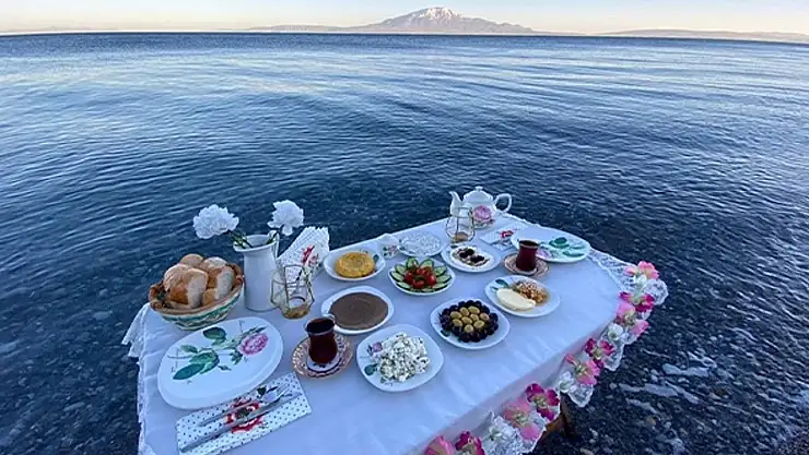 Van Gölü’nün turkuaz sularına karşı kurulan devasa sofralar, sabahın ilk ışıklarıyla birlikte misafirlerini ağırlamaya başlıyor.