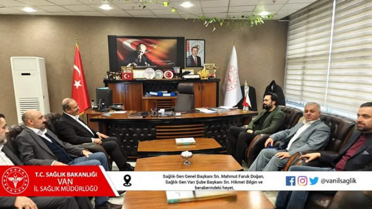 Sağlık-Sen Genel Başkanı Mahmut Faruk Doğan, Sağlık-Sen Van Şube Başkanı Hikmet Bilgin ve beraberindeki heyet, Van İl Sağlık Müdürü Op. Dr. Muhammed Tosun’u makamında ziyaret etti.
