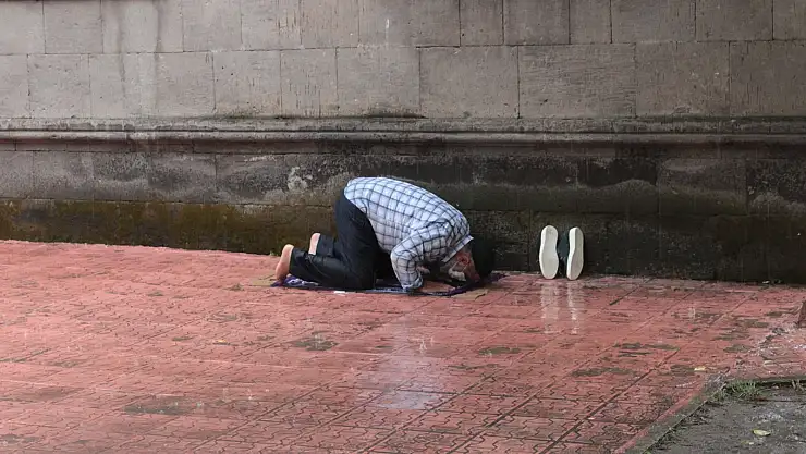 Ağrı'da bir vatandaş Cuma Namazını kılarken yağmura yakalandı.