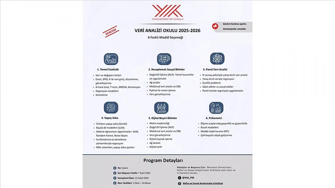Yükseköğretim Kurulu (YÖK) himayesinde hayata geçirilen Veri Analizi Okulu, Türkiye’de yapay zeka ve veri analizi alanında nitelikli insan kaynağı yetiştirmeyi hedefleyen ücretsiz bir eğitim programı sunacak. Marmara Üniversitesi Nüfus ve Sosyal Araştırmalar Enstitüsü koordinasyonunda, Ortadoğu Teknik Üniversitesi (ODTÜ), İstanbul Teknik Üniversitesi (İTÜ) ve Boğaziçi Üniversitesi’nin katkılarıyla hayata geçirilen program, 1 Ekim 2025 itibarıyla katılımcılara eğitim vermeye başlayacak ve 24 Nisan 2026’ya kadar sürecek.
